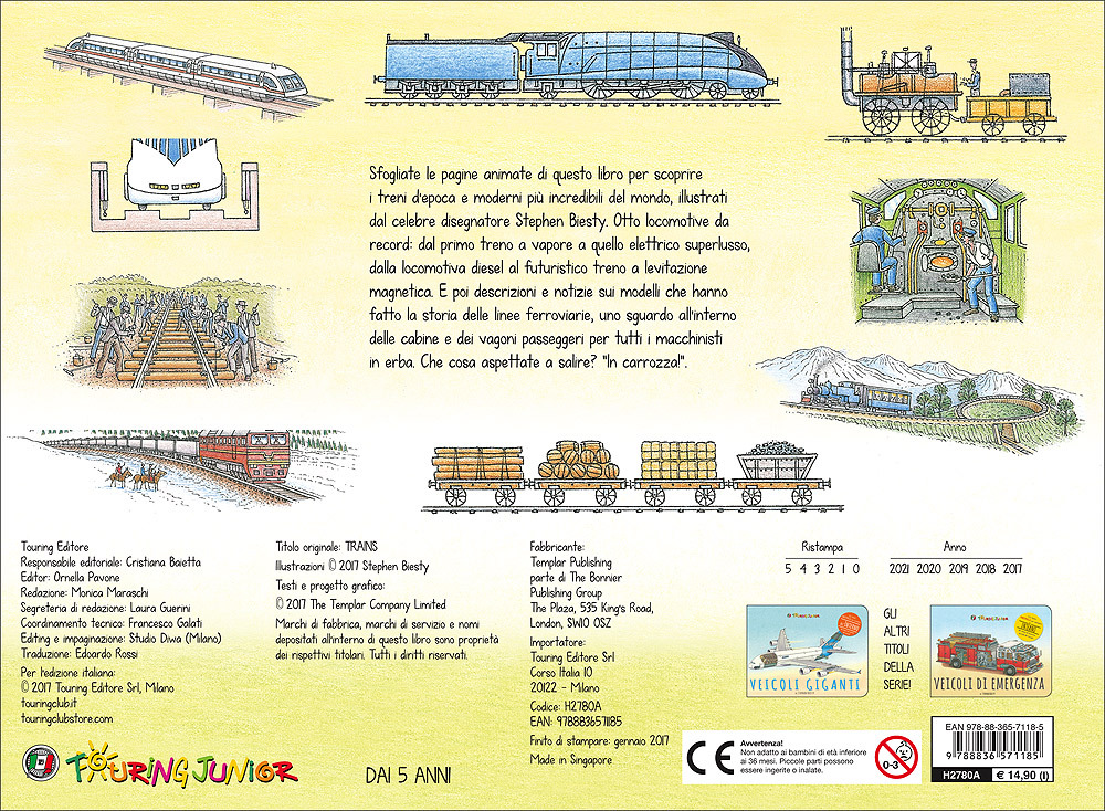 Sfogliate le pagine animate di questo libro per scoprire i treni d'epoca e moderni più incredibili del mondo, illustrati dal celebre disegnatore Stephen Biesty. Otto locomotive da record: dal primo treno a vapore a quello elettrico superlusso, dalla locomotiva diesel al futuristico treno a levitazione magnetica. E poi descrizioni e notizie sui modelli che hanno fatto la storia delle linee ferroviarie, uno sguardo all'interno delle cabine e dei vagoni passeggeri per tutti i macchinisti in erba. Che cosa aspettate a salire? ''In carrozza!''
